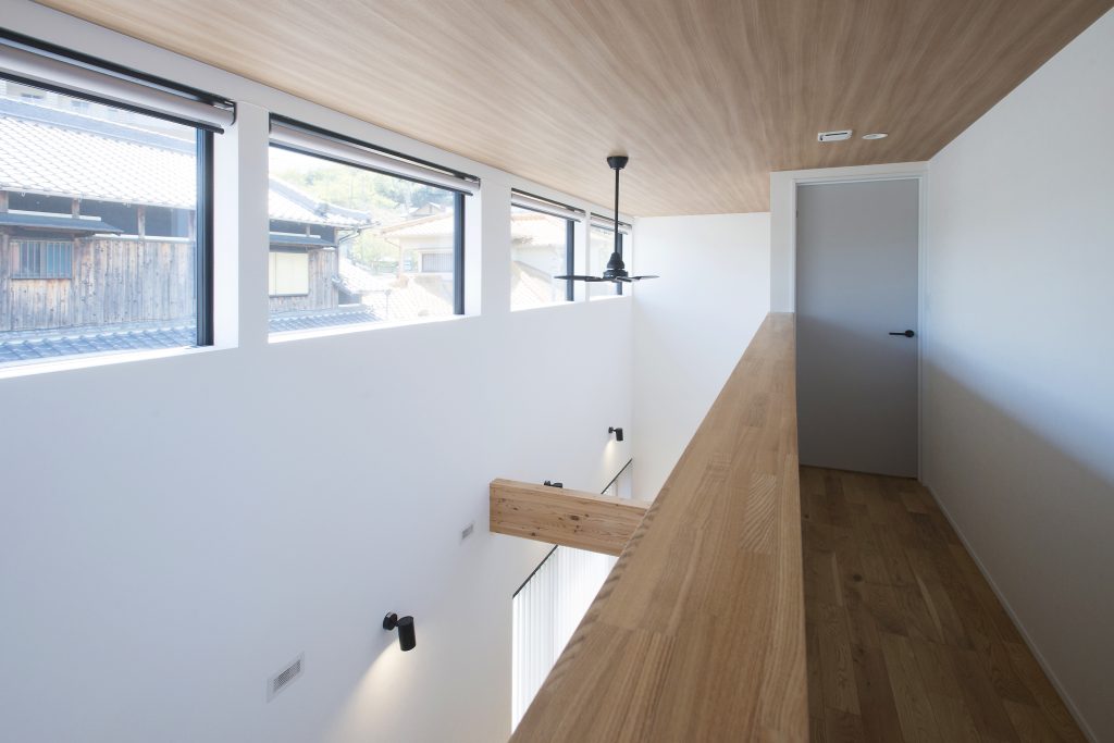 南側が大きな立体駐車場なので、明るい家にするために窓を大きく取ったが、駅前の人通りが多いところなので外から見えないように工夫しました。