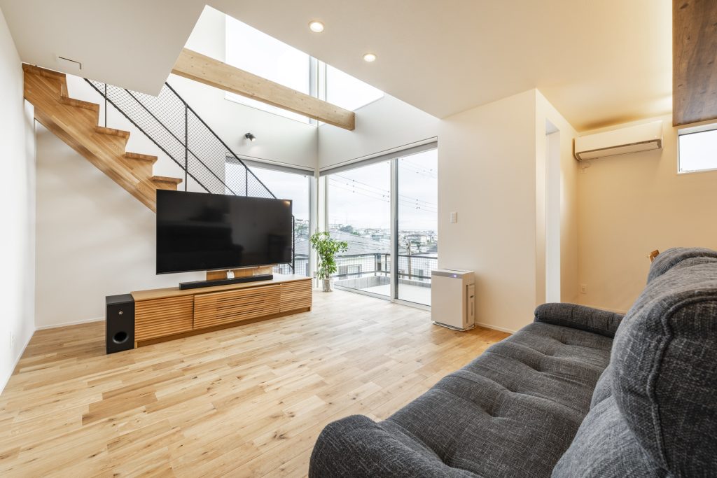 一日中明るく且つ、広く使えるLDKを実現する為に設置した見せ場ともなりえる階段の配置がPoint!