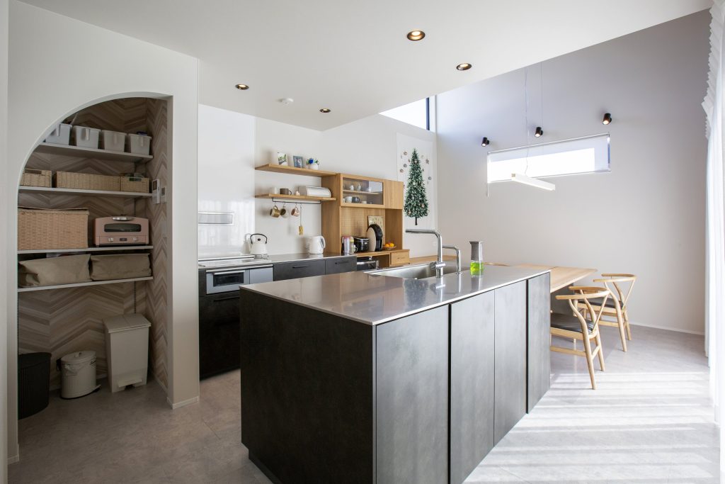 キッチン横の便利なパントリーを設置。家事動線抜群の水回りにアーチ壁の入り口にも注目!