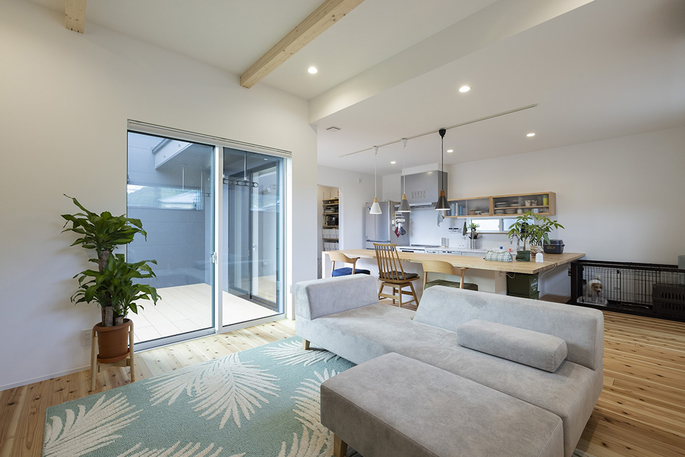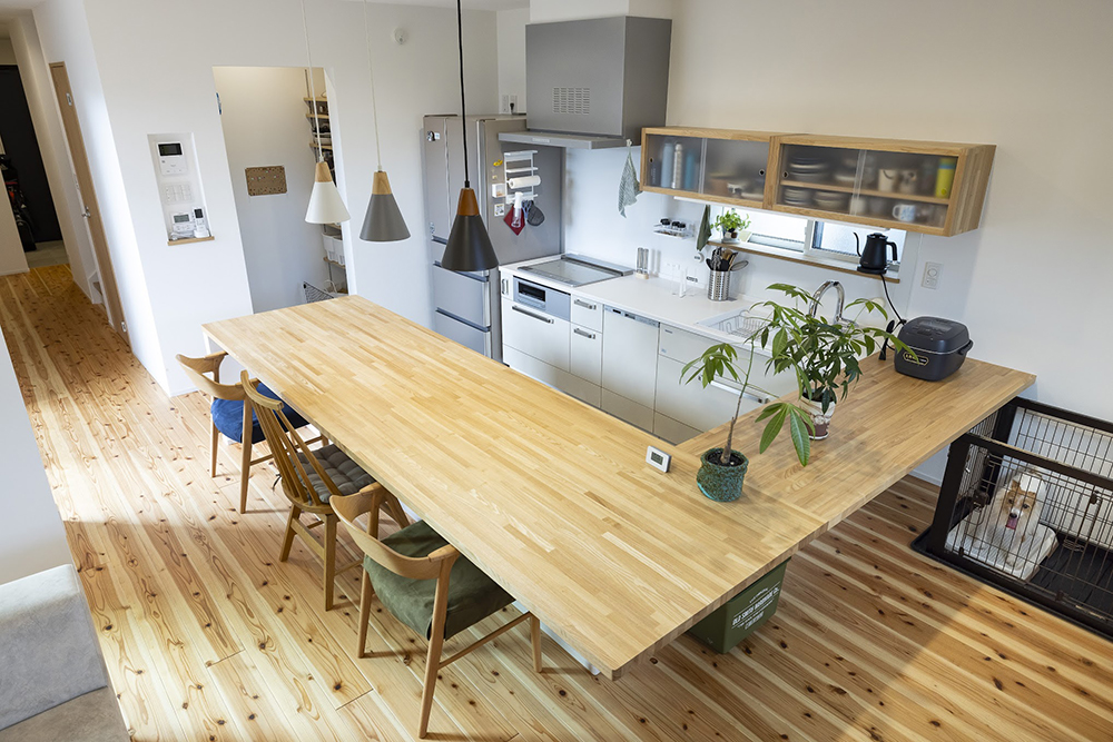 キッチンからはリビングや中庭まで見渡せるよう設計していただいたので、愛犬が遊び回っている様子を見守りながら料理ができます。また、キッチン奥には電子レンジや家電を収納できるパントリーの場所も絶妙で、短い動線で家事ができるのでとても便利になりました。