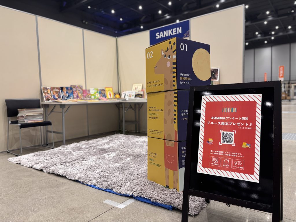 会場内でひときわ親子連れの笑顔が集まったのが、絵本未来創造機構・高井先生による読み聞かせプログラムです。本セッションでは、最初の30分間、高井先生が大人気の絵本をゆったりと読み聞かせ、子どもたちは物語の世界に引き込まれていきました。読み聞かせの後には、高井先生と三建の小見氏、荒巻氏が登壇し、知育に関する住環境講座のトークセッションを開催。絵本を通じて子どもの感性や想像力を育む大切さ、そして住まいの環境が子どもの発達や学びにどのような影響を与えるのかについて、三者それぞれの視点から意見を交わしました。トークでは、空気環境や照明計画のあり方など、家庭での“日常空間”が知育の可能性を広げる重要な要素であることが、研究データや具体例を交えながらわかりやすく紹介され、来場者は熱心に耳を傾けていました。また、SANKENブースでは、知育の一環として「絵本のリユースコーナー」を設置。もう使わなくなった絵本を集め、自由に手に取って読んでいただけるミニ図書館として展開しました。親子で絵本を選び、ページをめくる穏やかな時間が生まれ、「絵本を通じた学びと循環」を体感できる場として、多くの来場者に好評をいただきました。