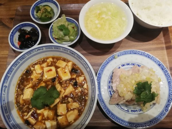 ご飯、スープ、副菜3種、メイン1品、小龍包3個、メインは日替わりです。