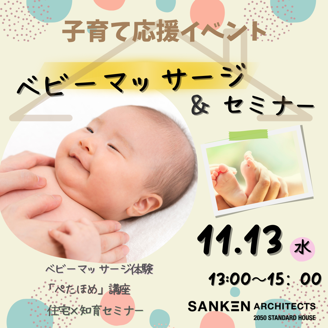 姫路市のSANKEN展示場”FORES”にて、ベビーマッサージ体験&知育イベントを開催します。 イベントでは、家族でのふれあいを深める「ベビーマッサージ」体験や子どもとのふれあいを通じ、住環境がどのようにして子どもの知的 … 続きを読む ベビーマッサージ体験~【同時開催】藤田敦子先生「ぺたほめ」教育セミナー、知育に適した住環境作りセミナー