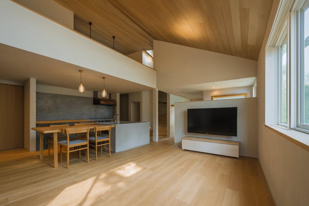 ■ 視線が空へ抜ける!光と風を取り込む勾配天井LDK