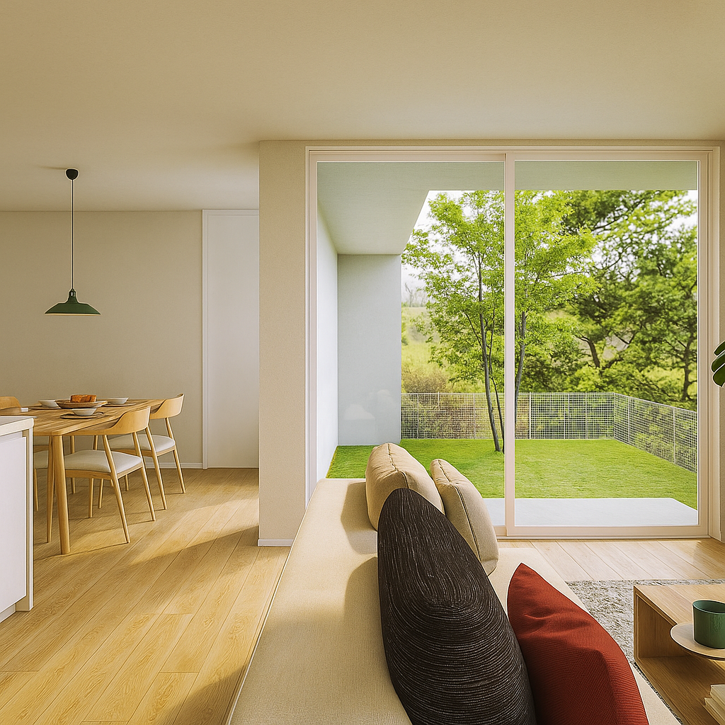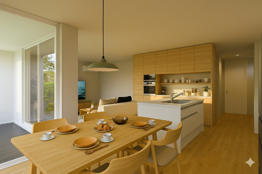 生活のすべてがワンフロアで完結する平屋のメリットを最大限に活かし、広々としたLDKには視覚的な広がりを生む工夫が凝らされています。