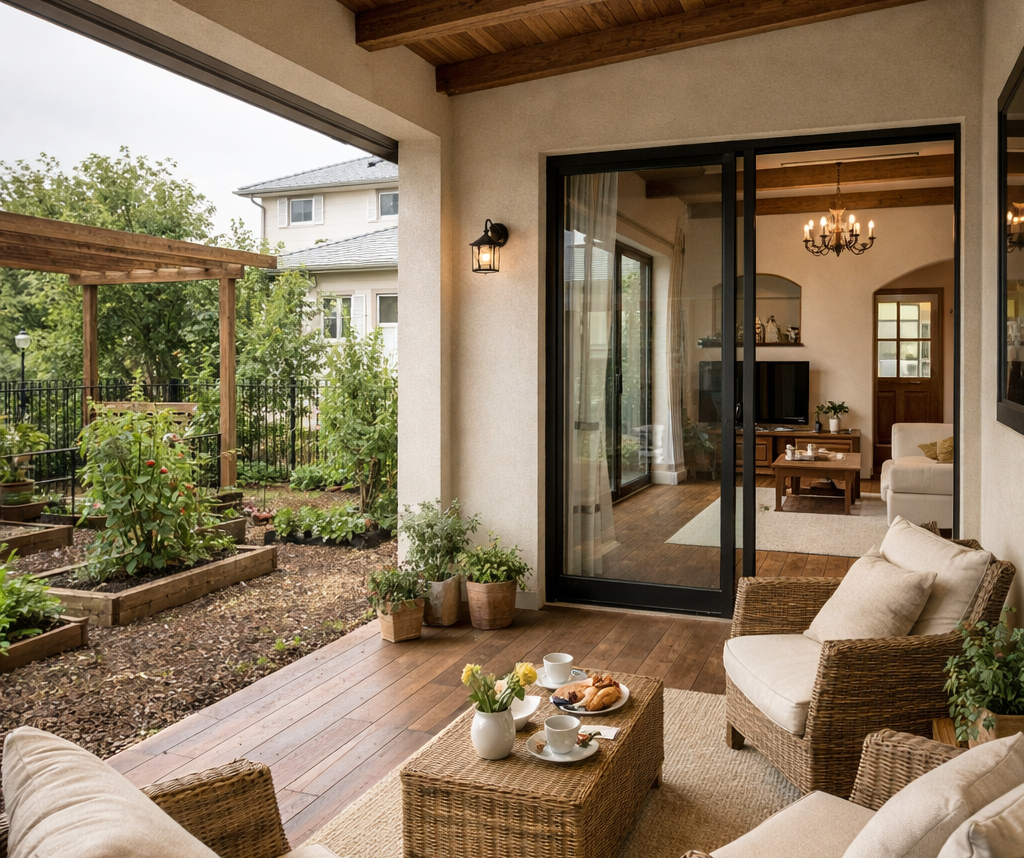 菜園へとつながる屋根付きテラスは、内と外が心地よく溶け合う場所。週末のブランチや趣味のガーデニングなど、自然を身近に感じる豊かな時間が広がります。なリラックスタイムを愉しめます 。
