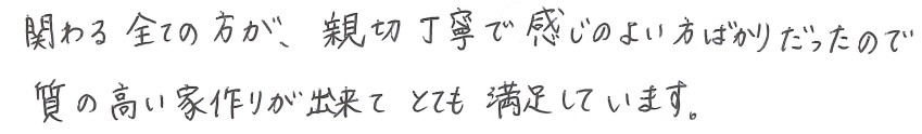 関わる全ての方が、親切丁寧で感じのよい方ばかりだったので質の高い家作りが出来てとても満足しています。