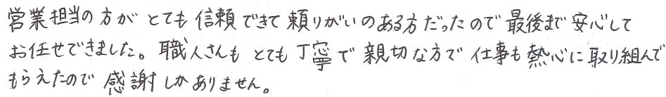 営業担当の方がとても信頼できて頼りがいのある方だったので最後まで安心してお任せできました。