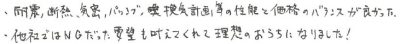 ・耐震、断熱、気密、パッシブ、換気計画等の性能と価格のバランスが良かった。