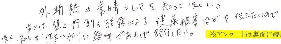 あとは壁の内側の結露による健康被害などを伝えたいので友人・知人が住まいづくりに興味があれば紹介したい。