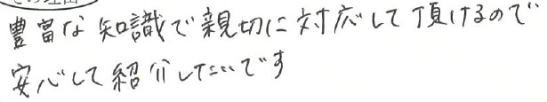 豊富な知識で親切に対応して頂けるので安心して紹介したいです