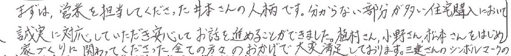まずは、営業を担当してくださった井本さんの人柄です。分からない部分が多い住宅購入において誠実に対応していただき安心してお話を進めることができました。植村さん
