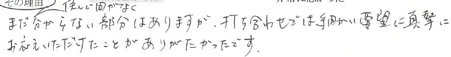 まだ住んで間がなく分からない部分はありますが、打ち合わせでは細かい要望に真摯にお応えいただけたことがありがたかったです。