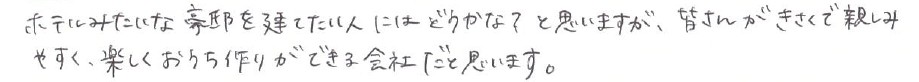 ホテルみたいな豪邸を建てたい人にはどうかな?と思いますが、皆さんがきさくで親しみやすく、楽しいおうち作りができる会社だと思います。