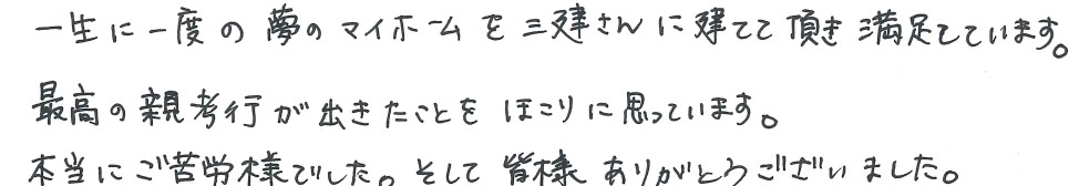 一生に一度の夢のマイホームを三建さんに建てて頂き満足しています。
