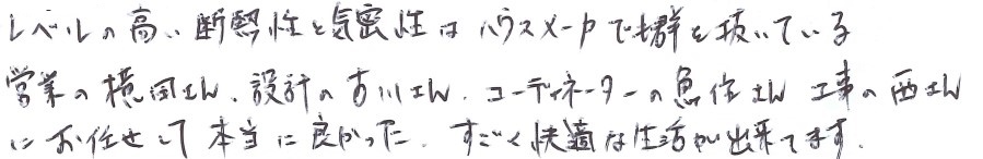 営業の横田さん、設計の古川さん、コーディネーターの魚住さん、工事の西さんにお任せして本当に良かった。