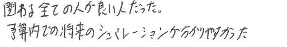 関わる全ての人が良い人だった。予算内での将来のシュミレーションが分かりやすかった。