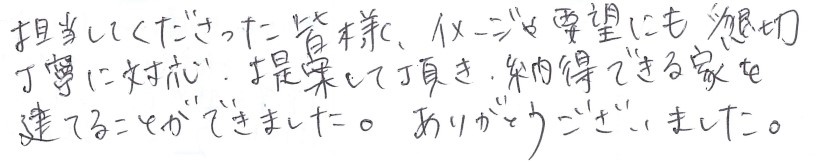 担当してくださった皆様、イメージや要望にも懇切丁寧に対応・提案して頂き、納得できる家を建てる事ができました。