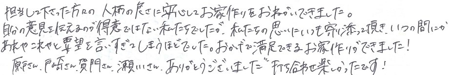 担当して下さった方々の人柄の良さに安心してお家作りをおねがいできました。