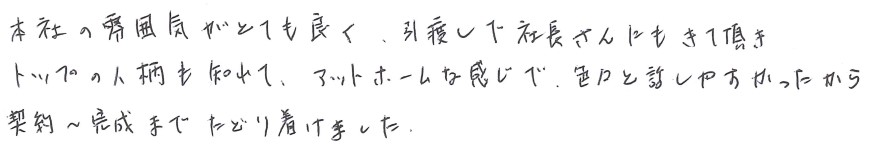 本社の雰囲気がとても良く、引渡しで社長さんにもきて頂き