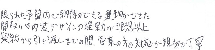 限られた予算内で納得のできる建物ができた間取りや内装デザインの提案力が理想以上契約から引渡しまでの間、営業の方の対応が親切で丁寧