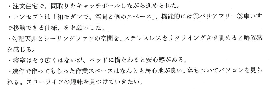 ・コンセプトは「和モダンで、空間と個のスペース」、機能的には①バリアフリー③車いすで移動できる仕様、をお願いした。