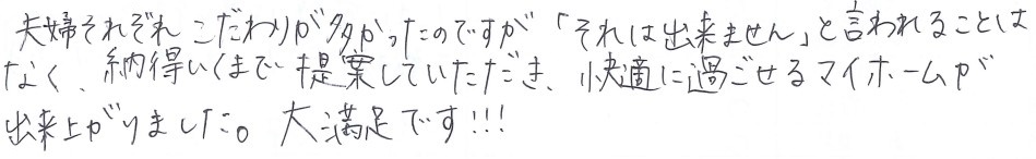 夫婦それぞれこだわりが多かったのですが「それは出来ません」と言われることはなく、納得いくまで提案していただき、快適に過ごせるマイホームが出来上がりました。大満足です!!!