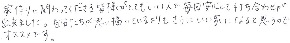 家作りに関わってくださる皆様がとてもいい人で毎回安心して打ち合わせが出来ました。自分たちが重い描いているよりもさらにいい家になると思うのでオススメです。