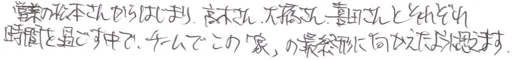 営業の松本さんからはじまり、高木さん、大橋さん、喜田さんとそれぞれ時間を過ごす中で、チームでこの「家」の最終形に向かえたように思えます。