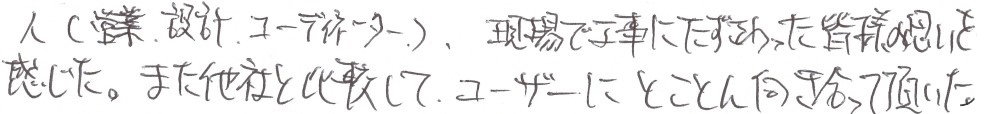 人(営業・設計・コーディネーター)、現場で工事にたずさわった皆様の思いを感じた。