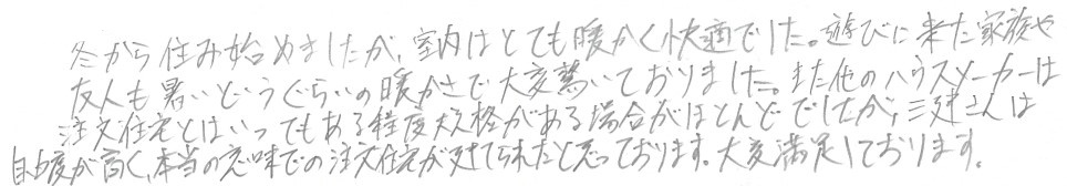 冬から住み始めましたが、室内はとても暖かく快適でした。遊びに来た家族や友人も暑いというぐらいの暖かさで大変驚いておりました。また他のハウスメーカーは注文住宅とはいってもある程度規格がある場合がほとんどでしたが、三建さんは自由度が高く、本当の意味での注文住宅が建てられたと思っております。大変満足しております。