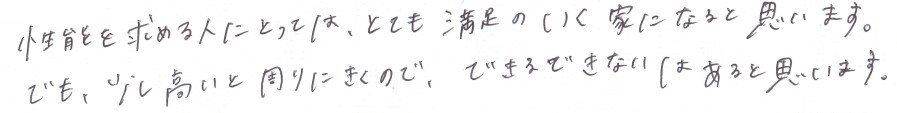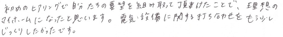 初めのヒアリングで自分たちの要望を組み取って頂けたことで、理想のマイホームになったと思います。電気・設備に関する打ち合わせをもう少しじっくりしたかったです。