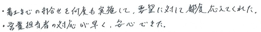 ・着工までの打合せを何度も実施しで、要望に対して都度応えてくれた。