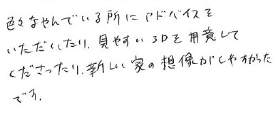 色々なやんでいる所にアドバイスをいただいたり、見やすい3Dを用意してくださったり、新しい家の想像がしやすかったです。