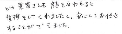 どの業者さんも顔を合わせると挨拶をしてくれましたし、安心してお任せすることができました。