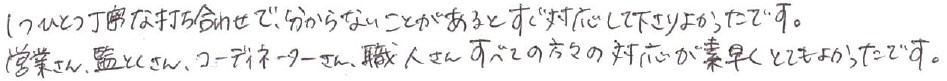 1つひとつ丁寧な打合せで、分からないことがあるとすぐ対応して下さりよかったです。