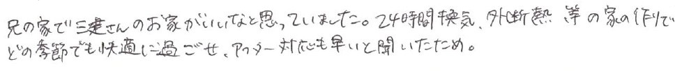 兄の家で三建さんのお家がいいなと思っていました。24時間換気、外断熱、等の家の作りでどの季節でも快適に過ごせ、アフター対応も早いと聞いたため。