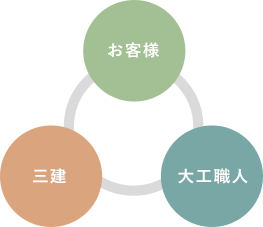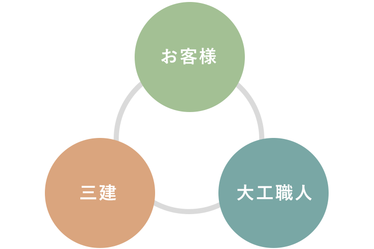お客様の声に真摯に耳を傾け、プロとして家造りのお手伝いをさせていただくこと。そのためには、三つの点が繋がり一体となってきちんと機能していくことが大切です。社名の「三建」もそうあり続けたいという願いから命名しました。常にお客様を第一に考え、夢をともに叶えていく、これが(株)三建の変わらぬ姿勢。さあ、生涯の家づくりをご一緒に始めましょう。