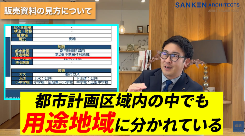 見落としがちなのが、資料下部に記載されている「用途地域」です。これは「その土地に何を建てていいか」というルールです。