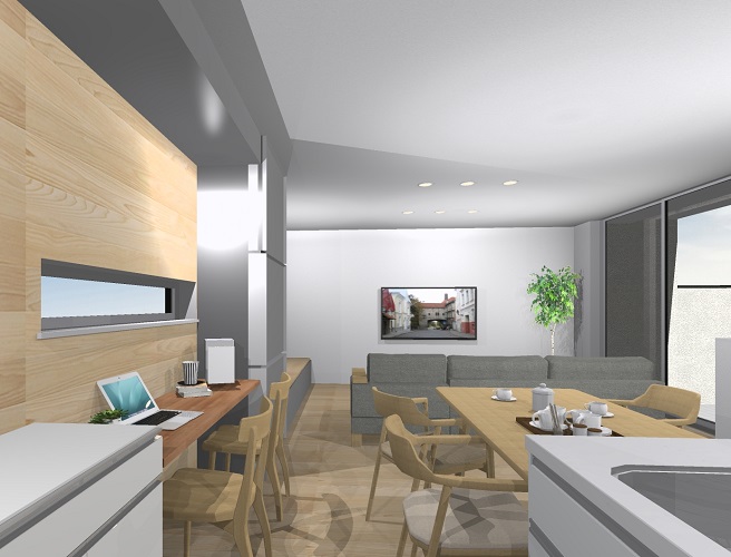 リビングに勉強や作業ができる大きなダイニングテーブルを置く場所や、机や壁に向かって座れるようなカウンターを計画したり、ご飯の支度をしてる時、子供の様子が目の届くところで確認しやすいです。