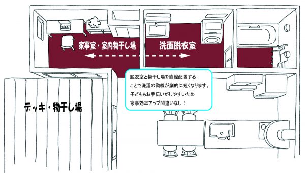 例えば、水周りとサンルーム、収納スペースなどを一直線に配置すれば洗濯の