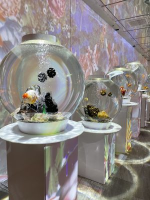 見たことない金魚の種類や、プロジェクションマッピングやミラーボールを使用した華やかな空間に目を奪われました