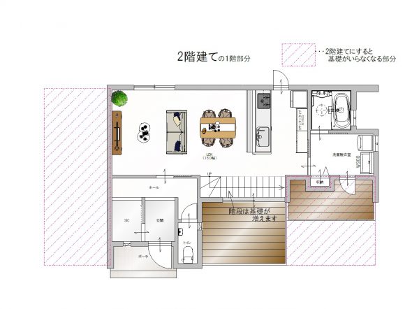2階建てを計画した場合、平屋の中で言うところの子供部屋や寝室は、2階に造ることが多いので下の図↓↓のように、基礎が不要になってきます。