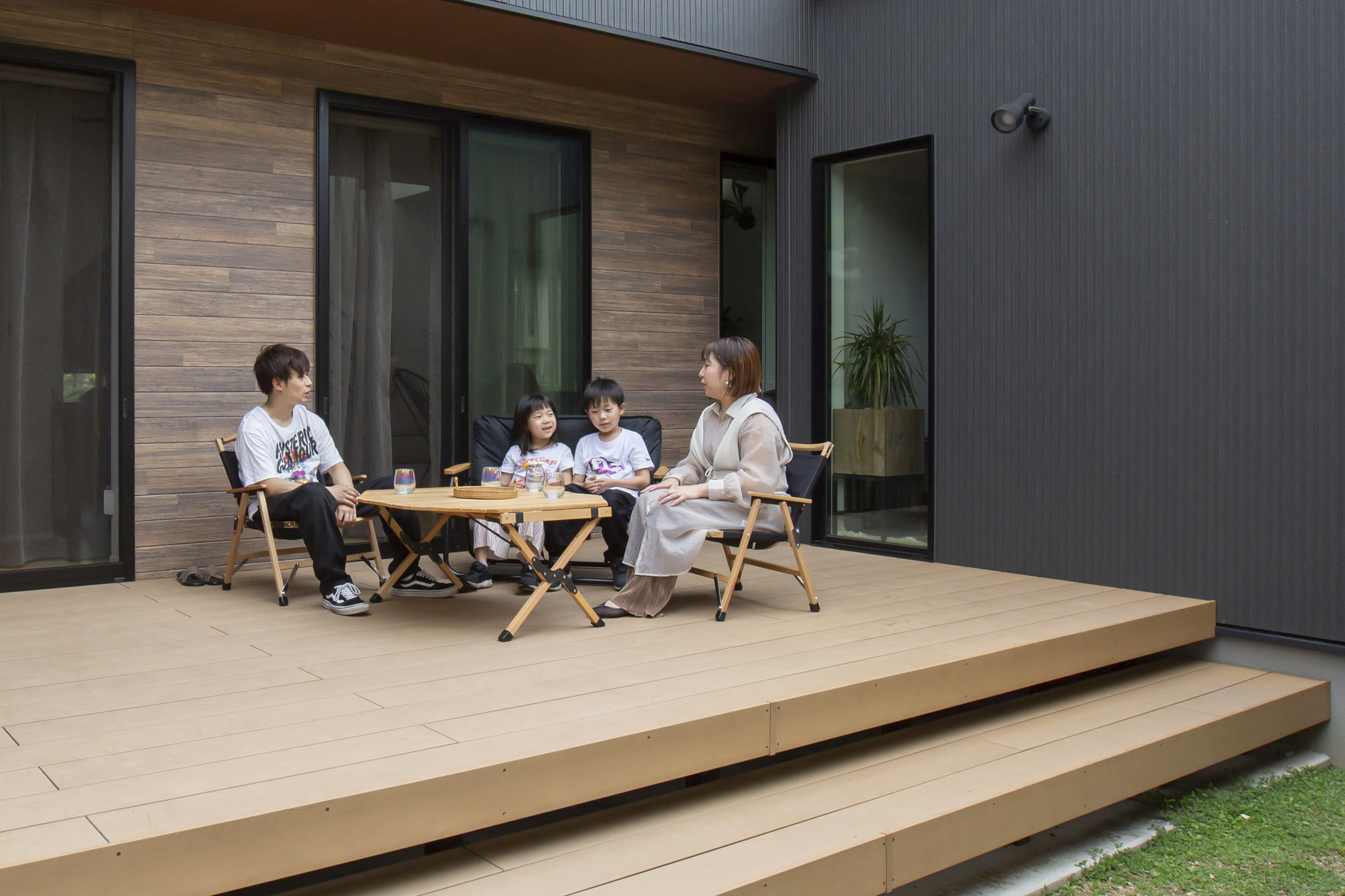 採用したオーナー様は「リビングが広くなったように感じる」「縁側のように座ってお茶することができる」「子ども達が安心して遊べる」など、室内の延長・屋外の憩いの広場として活躍しているようです。