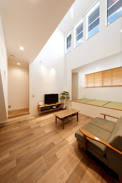 高天井の窓がプライバシーを守りつつ明かりをリビングに差し込んでくれます。