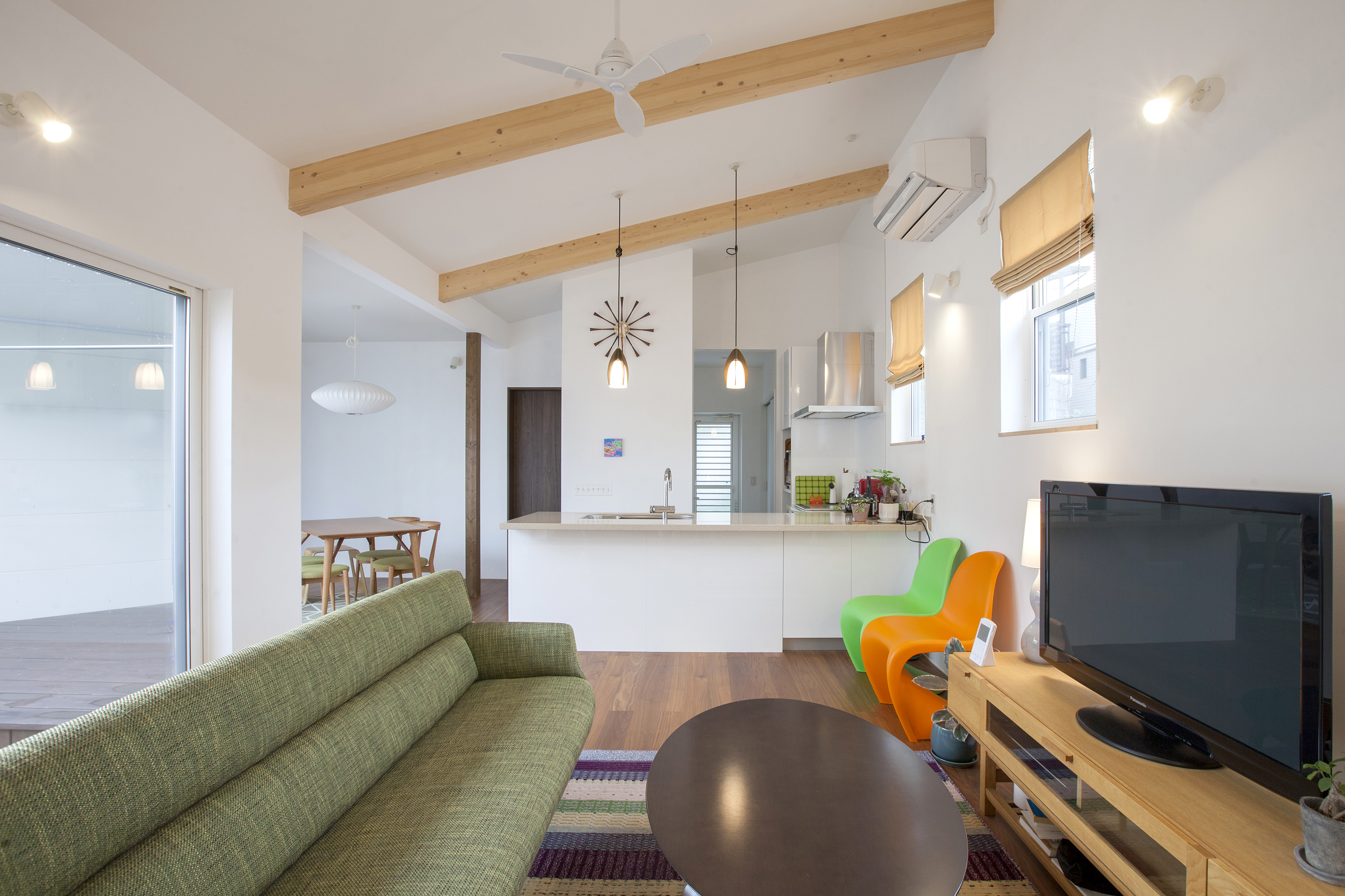 家具でオレンジや緑のアクセントカラーを入れたポップなリビングが素敵です。