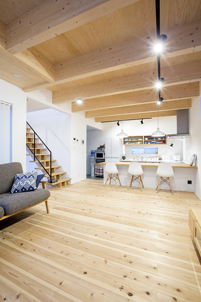 床材には無垢の杉板を使用。木の質感を大胆にあしらった内装は、