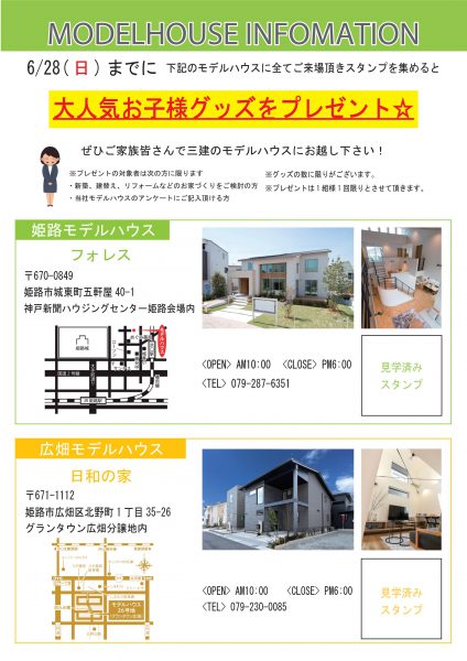 姫路エリアの2つのモデルハウスを6/28(日)までにご来場頂きますと、