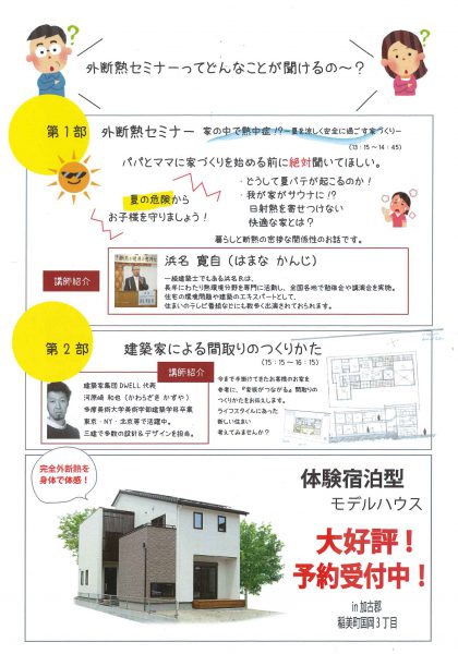 今回のセミナーは一級建築士で熱環境分野を専門に活動されている、浜名寛自先生をお招きし夏を快適に過ごす家づくりの秘密についてお話頂きます。