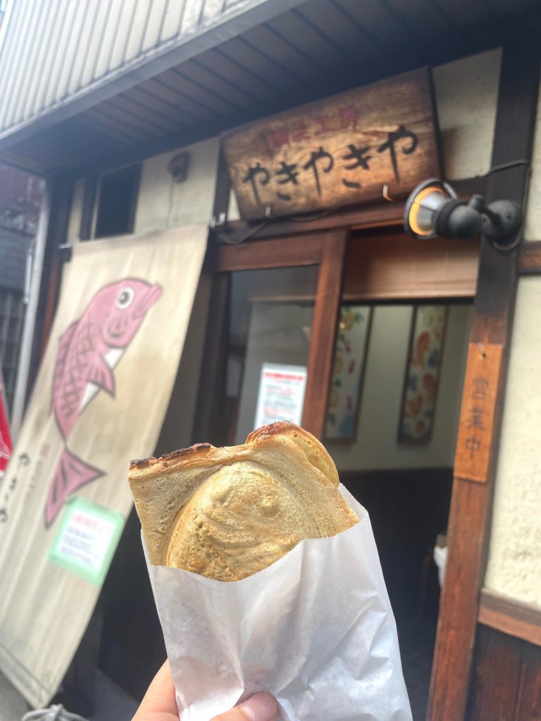 生地にしっかり粒感の残ったあんこが入っている鯛焼きは薄皮で平べったくてパリッと焼き上がっています。
